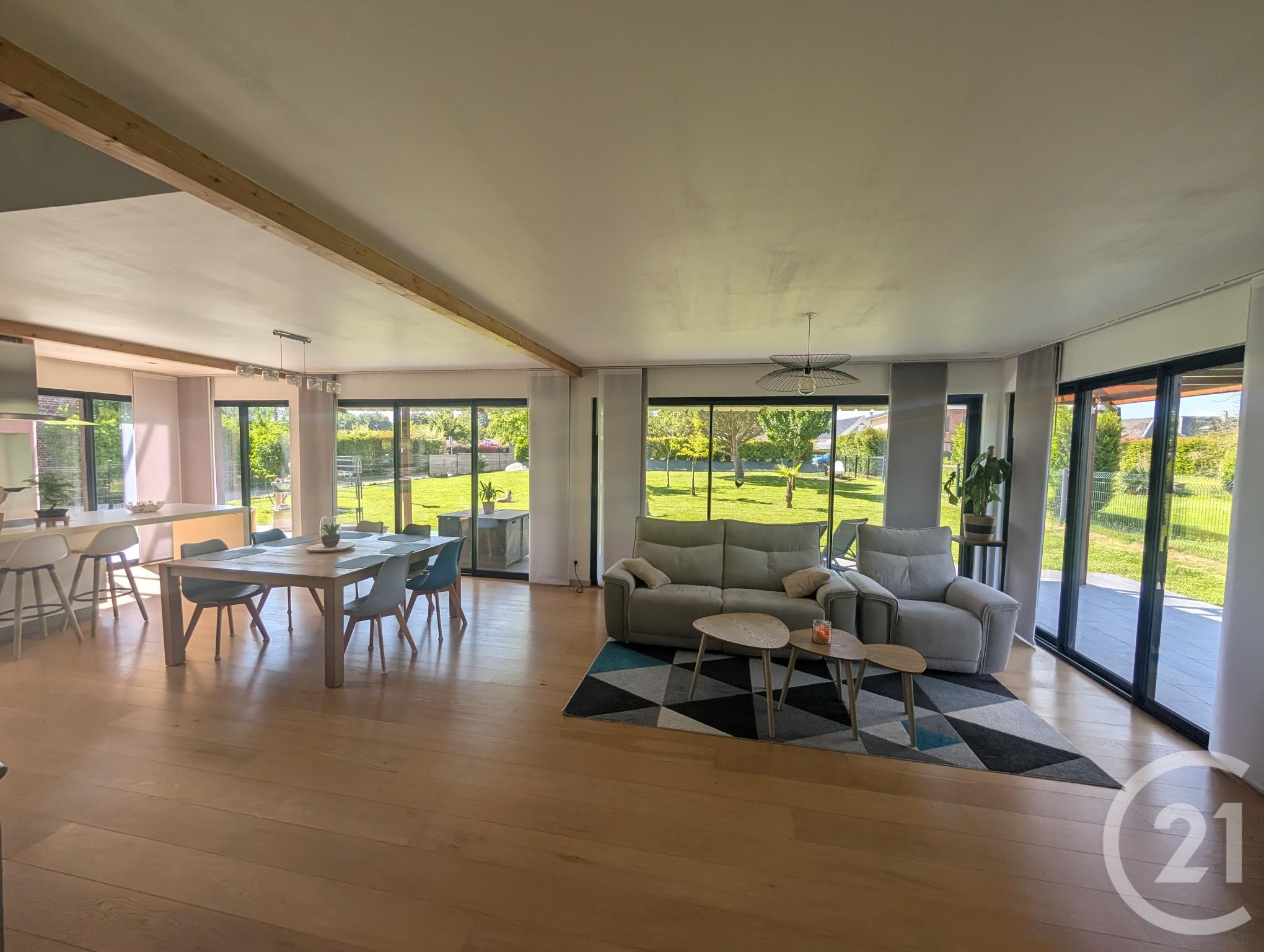 Dès l'entrée, vous serez séduits par la pièce de vie spacieuse et baignée de lumière grâce à ses grandes baies vitrées.